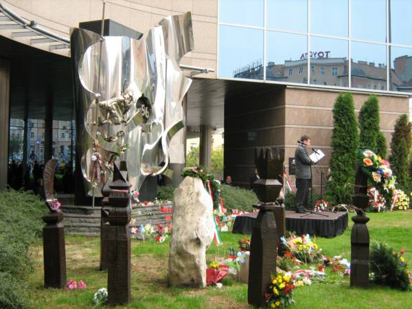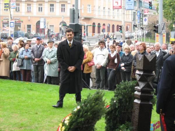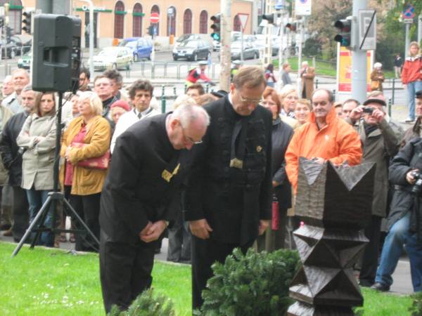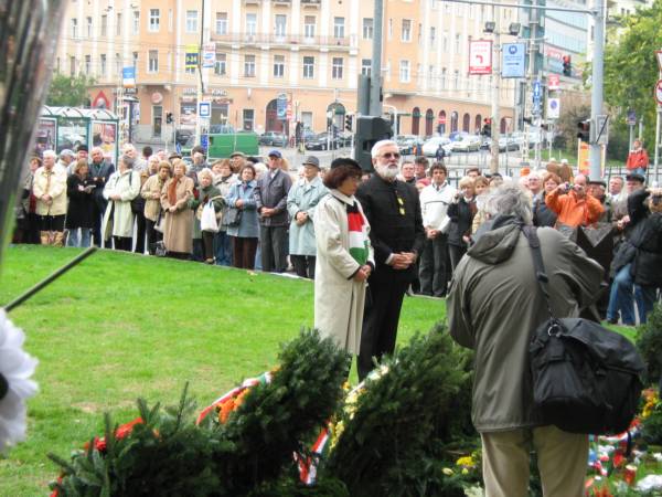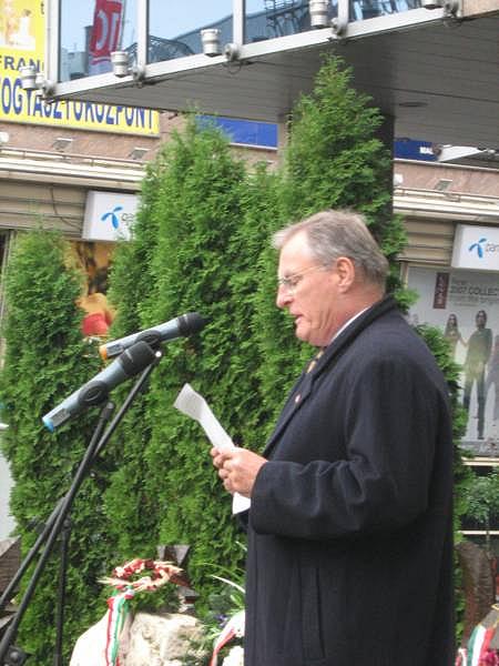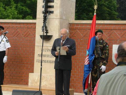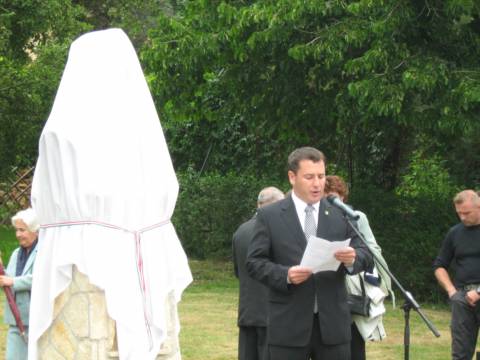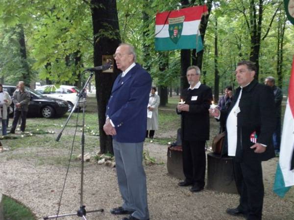 Tisztelt Hölgyeim és Uraim, a máriaremetei Magyarság Emlékdomb természetesen nem Királydomb, nem csupán azért, mert senki sem lovagol fel a tetejére, hogy kardjával a négy égtáj felé suhintson, hanem azért sem, mert bizony ebből nem hiányzik a száműzöttek csizmájának pora sem. Ugyanis a pesthidegkútiak gondoskodtak róla, hogy a határon túlra száműzött magyarság szülőföldjéből is kerüljön ide egy-egy marékkal, hogy ezen a helyen az egész nemzet jelképesen újraegyesülhessen, ahogy ezt a torockói kopjafa is hirdetni fogja sokáig.- taps.