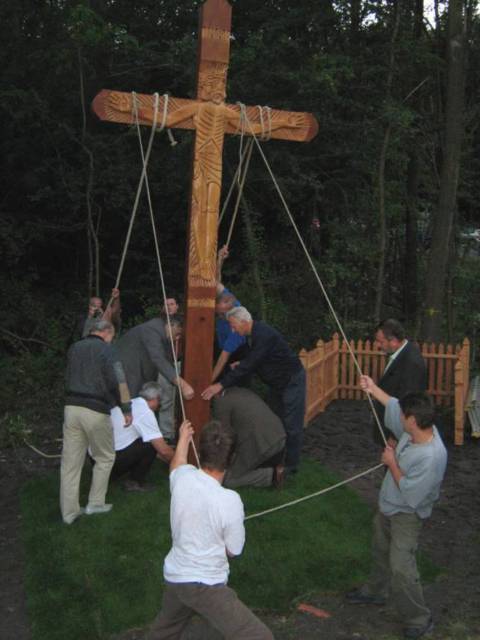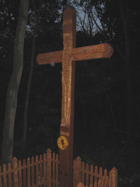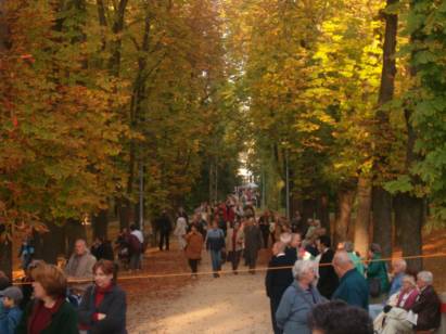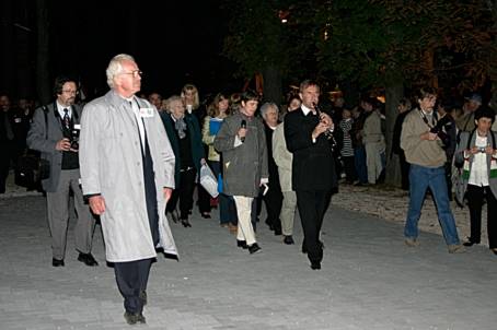 Az Emlékdombhoz vonulás útját – hogy el tudjátok képzelni – a ragyogó fényáradatban fürdő Szabadtéri Oltártól: elmentünk a Bazilka előtt, majd balra befordultunk a kizárólag fáklyafénnyel  megvilágított  Emlékdombhoz vezető útra. A vonulást, tárogatósunk és a kórus tagjai által régi himnuszunk, a „Boldogasszony Anyánk” kisérték.