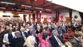 a zsúfolásig megtelt terem vendégei énekkórusként és fánkkóstolókként