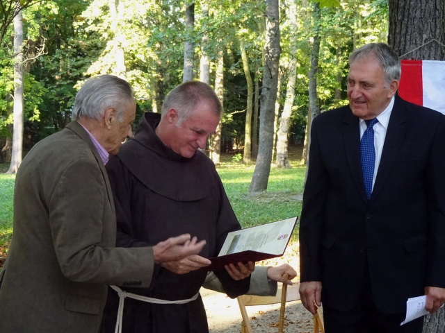 Böjte Csaba emlékül átveszi a kitüntetés másolatát