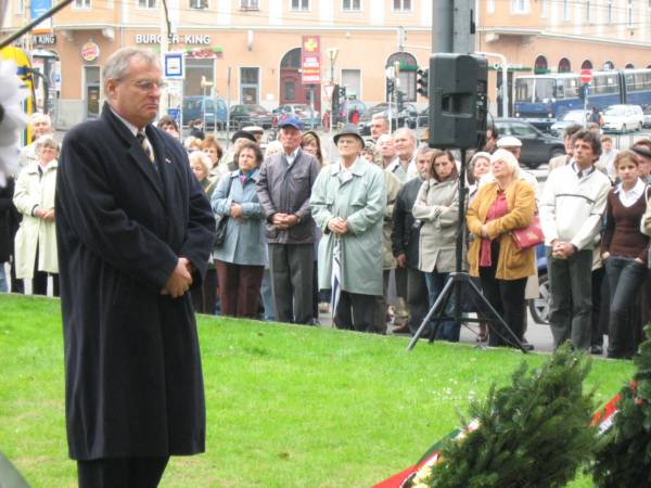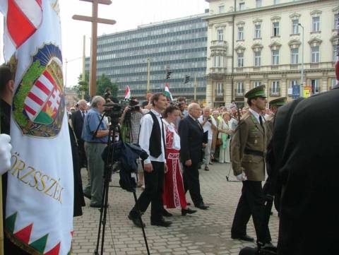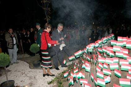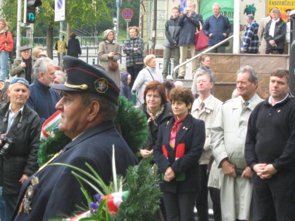 Tisztelt Hölgyeim és Uraim, a máriaremetei Magyarság Emlékdomb természetesen nem Királydomb, nem csupán azért, mert senki sem lovagol fel a tetejére, hogy kardjával a négy égtáj felé suhintson, hanem azért sem, mert bizony ebből nem hiányzik a száműzöttek csizmájának pora sem. Ugyanis a pesthidegkútiak gondoskodtak róla, hogy a határon túlra száműzött magyarság szülőföldjéből is kerüljön ide egy-egy marékkal, hogy ezen a helyen az egész nemzet jelképesen újraegyesülhessen, ahogy ezt a torockói kopjafa is hirdetni fogja sokáig.- taps.
