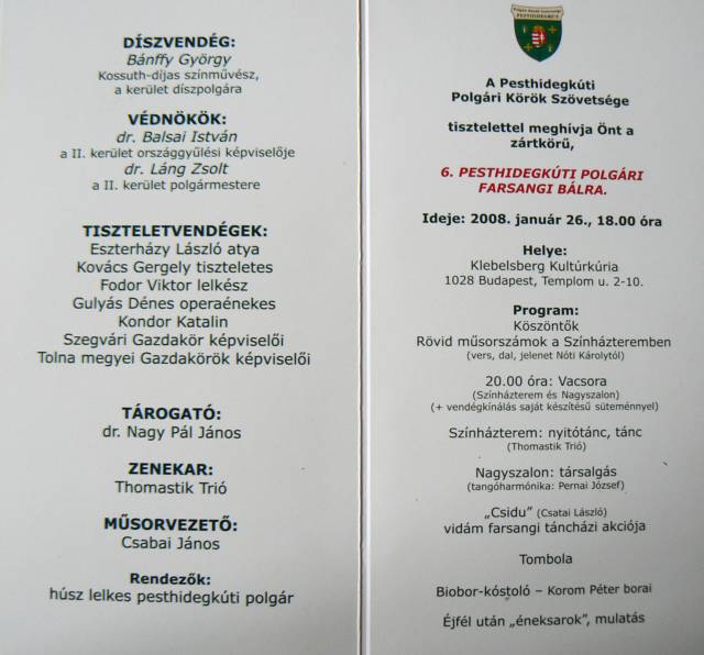 Tisztel Hölgyeim és Uraim! Kedves pesthidegkúti barátaim! Engedjék meg hogy különösen nagy tisztelettel köszöntsem Duray Miklóst és a történelmi egyházak képviselőit, - taps - és talán megértik, hogy különösen meleg baráti szeretettel köszöntöm Balsai István képviselőtársamat, - taps - és ahogyan lenni szokott, mindig a végéra hagyják azokat, akiket az először  kellet volna említeni, így kivájna általában a  szófűzés udvariassága, végül is, így elsősorban, szeretettel üdvözlöm a helyi polgári körök tagjait , vezetőit, akik  létrehozták ezt a mai estét és közreműködtek abban, hogy ma mindannyian otthon érezhessük magunkat. – taps.