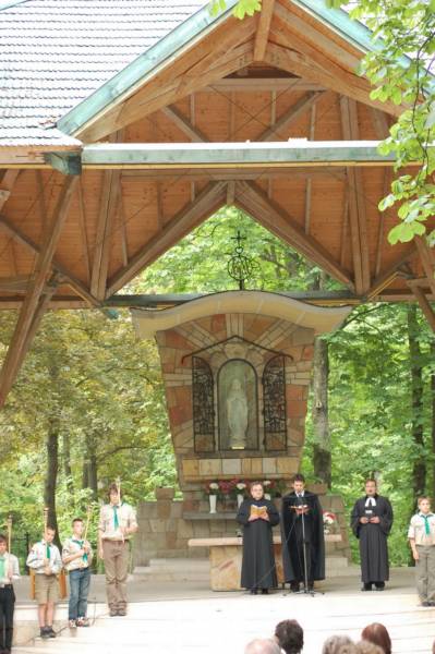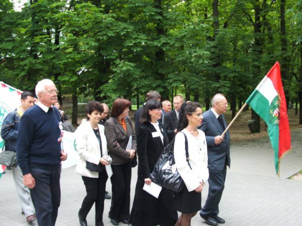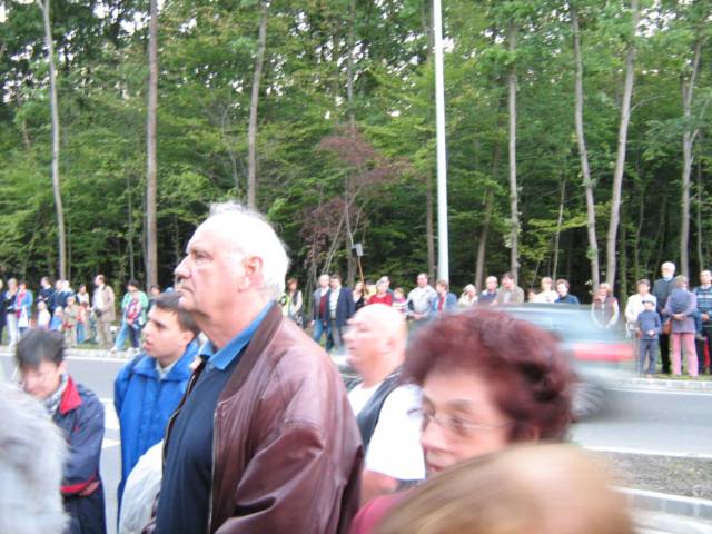 Az Emlékdombhoz vonulás útját – hogy el tudjátok képzelni – a ragyogó fényáradatban fürdő Szabadtéri Oltártól: elmentünk a Bazilka előtt, majd balra befordultunk a kizárólag fáklyafénnyel  megvilágított  Emlékdombhoz vezető útra. A vonulást, tárogatósunk és a kórus tagjai által régi himnuszunk, a „Boldogasszony Anyánk” kisérték.