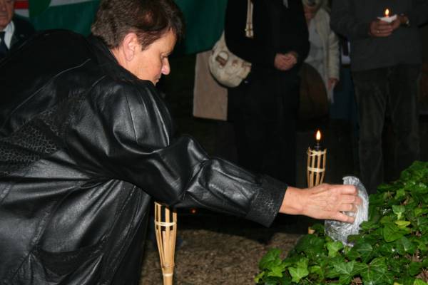 A tömegből elősorjáztak egymásután négy gyertyát  és négy tarisznyát tartva a kezükben. A „vakond” ajándékát, a tölcsérvirágot, amit a PPKSZ-nek hoztak, az Emlékkönyv asztalán hagyták, majd zászlócskákkal a dombhoz mentek.