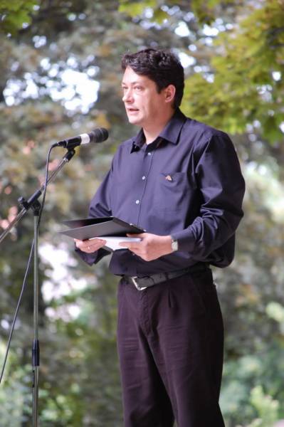 És természetesen nem hiányzott Csabai János barátunk sem a mikrofonjával, a tavalyi „Domb”-hoz hozott marék földek felolvasója. A tárogató hangja után Csabai János vezette az eseményeket: