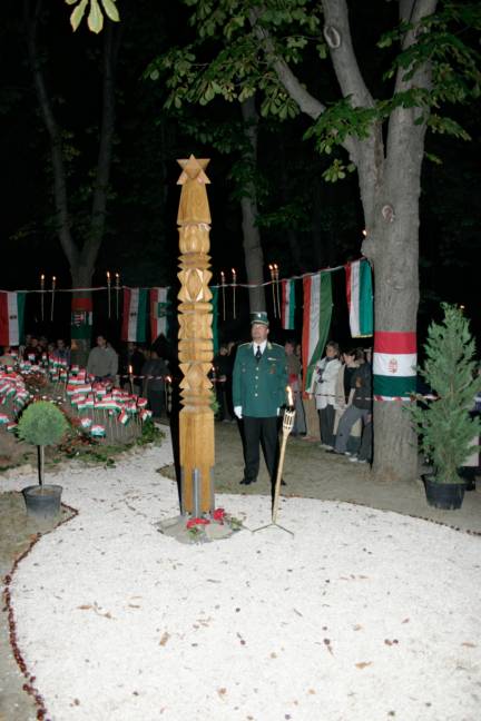Az Emlékdomb és a kopjafa is sűrűn rakott fáklyák fényében bukkant elő. A dombon 365 nemzeti színű – a tavalyi „marék föld” hozói által megírva – lobogott a szélben, a dombot körülölelő fák adtak nemzet és PPKSZ lobogókat „tartották”, két „48’-as honvéd” – korhű egyenruhában – állt őrséget és nem hiányzott az „asztal” sem erdélyi terítővel borítva, rajta székelyek faragta háromágú gyertyatartóval.